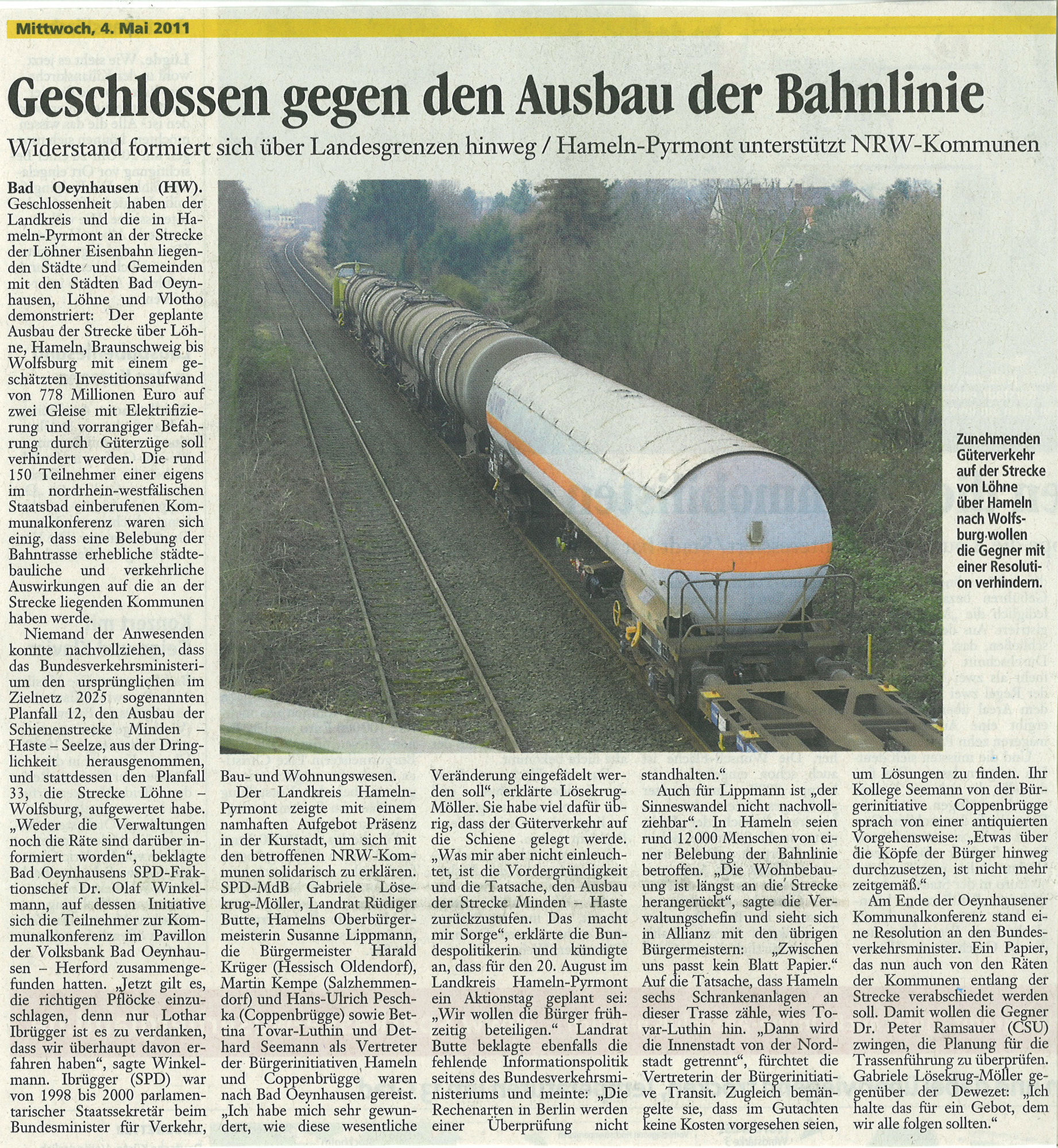 | 04.05.2011 | Deister- und Weserzeitung | Geschlossen gegen den Ausbau der Bahnlinie |