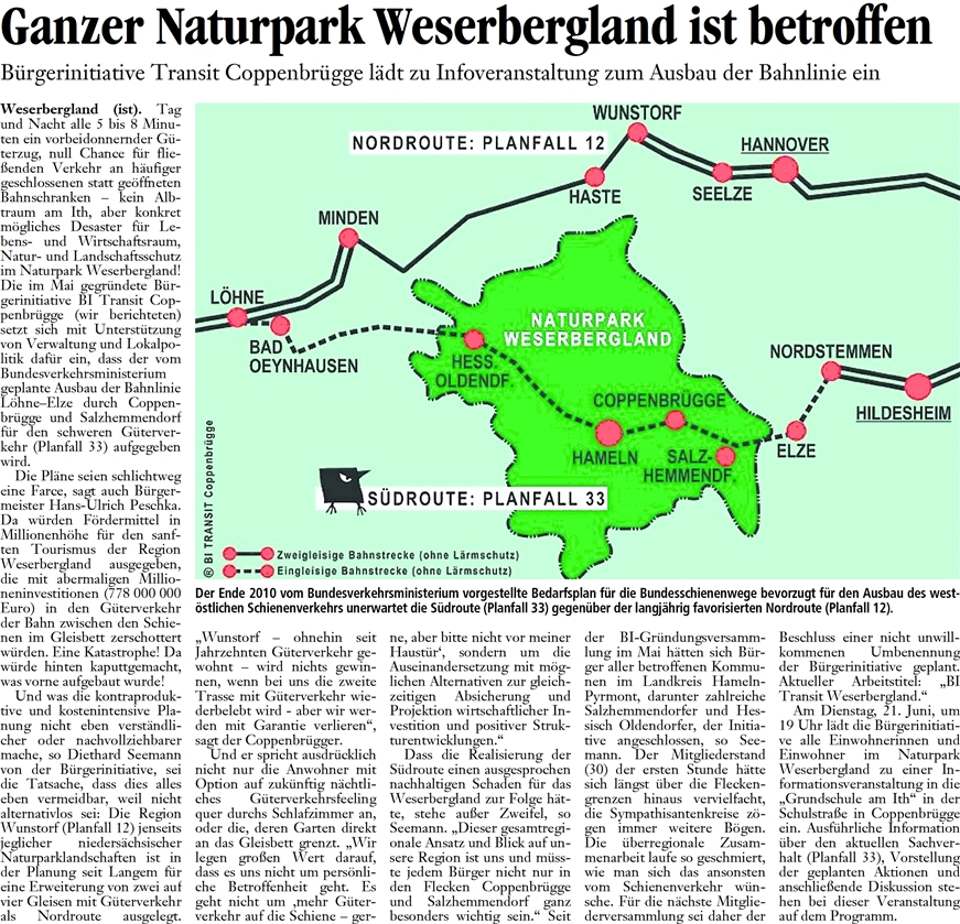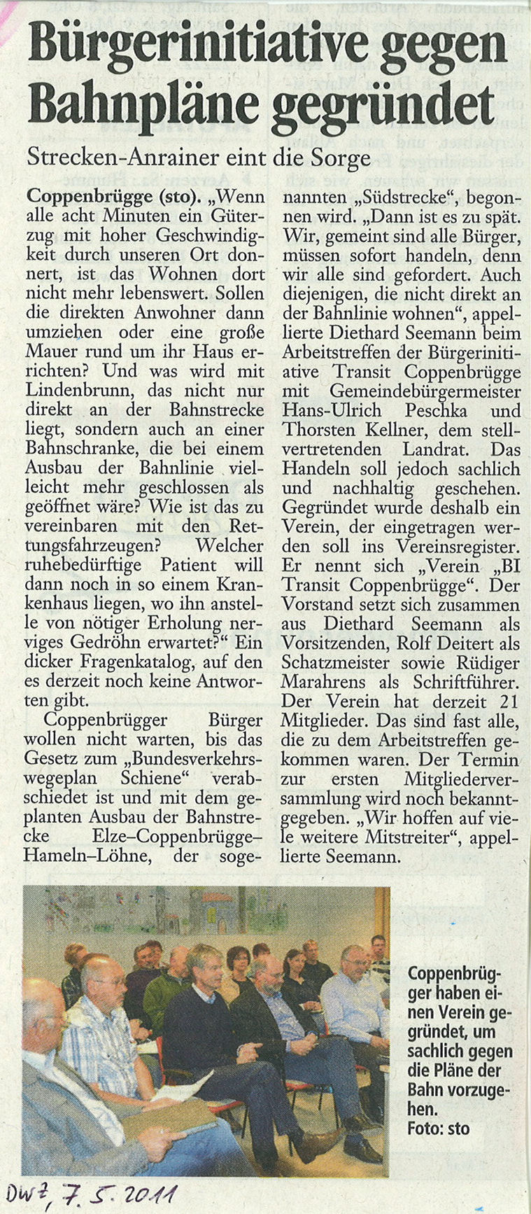 | 07.05.2011 | Deister- und Weserzeitung | Bürgerinitiative gegen Bahnpläne gegründet |