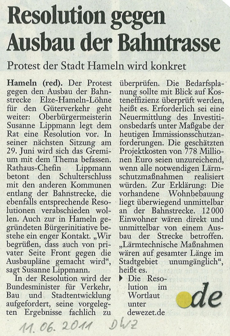 | 11.06.2011 | Deister- und Weserzeitung | Resolution gegen Ausbau der Bahntrasse |