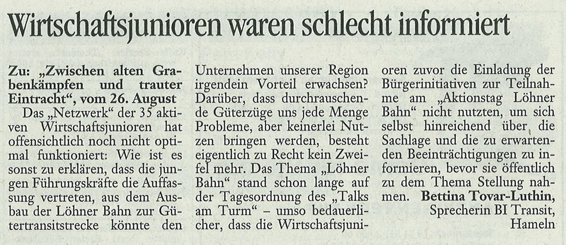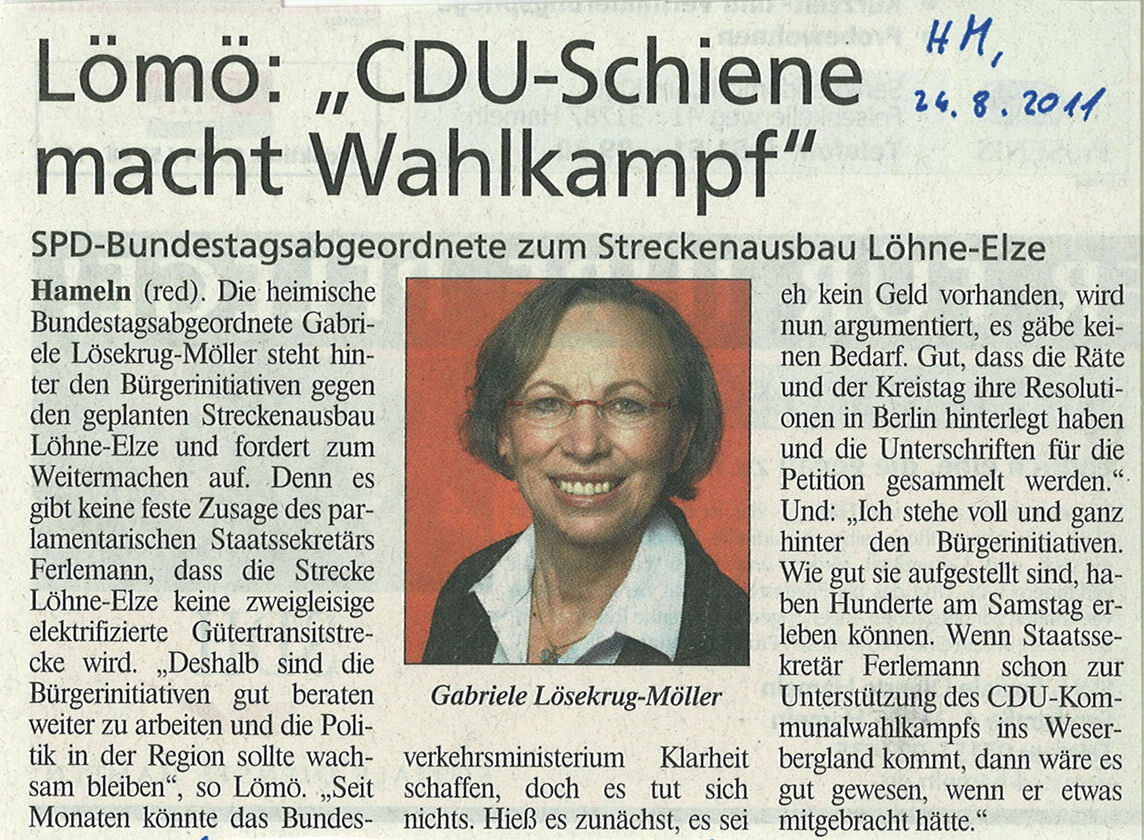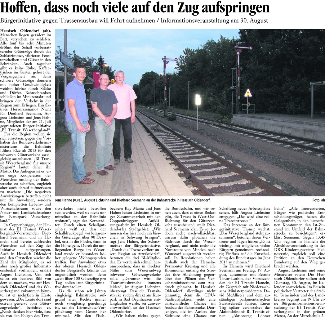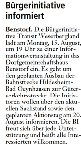 | 15.08.2011 | Deister- und Weserzeitung | Protest gegen geplanten Streckenausbau |