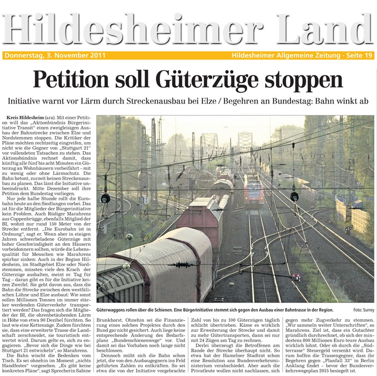 | 03.11.2011 | Hildesheimer Nachrichten | Petition soll Güterzüge stoppen |